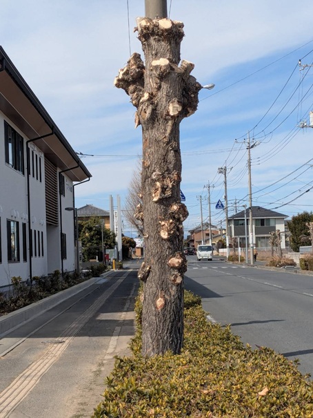 次に行なった上里町の役場前の道路のイチョウの剪定は、いつもの事ですが、文字通り切り詰めです。