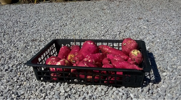 そんなことを考えながら収穫してみたら、やはり他の株も似たような感じで、1株から取れる芋は大きな芋が1本だけ…というのがほとんどでした。