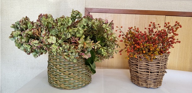 ※アジサイのドライフラワーの隣に写っているのは、散歩の時に取って来た野バラの実です。
