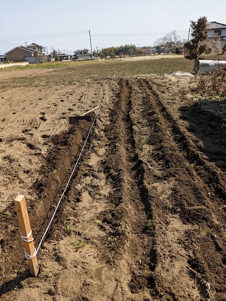 ② 畑にさくを切り、カットしたイモを30cm位ので間隔で置く。