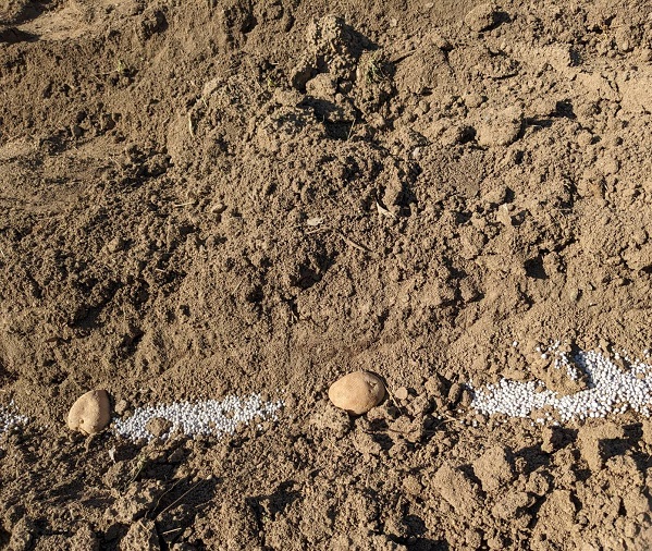 イモとイモの間に肥料を撒いて、土を掛ける。